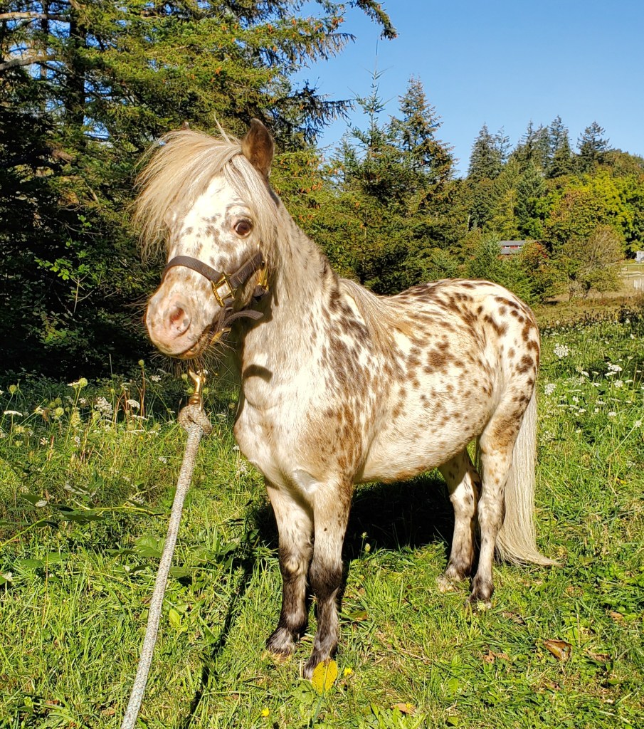 Jasper is our AMHA Miniature Horse stallion. He is a beautiful leopard spotted buckskin appaloosa and 30 inches tall. Jasper enjoys a good grooming, long walks, and tasty tidbits. He is very curious and sweet.